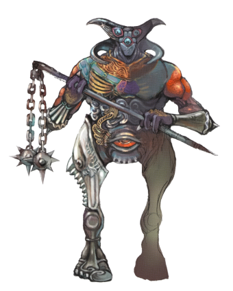 "Servant of the gods in charge of guarding the castle. Its enormous spiked morningstar even strikes fear in the hearts of creatures lurking around the castle.
