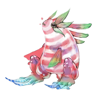 "An amphibian loving water and moist places. Countless people have been fooled by their cute pink striped appearance and gotten a beating. Try to burn it up before getting frozen stiff. The fragrant scent of its meat will fill the air."